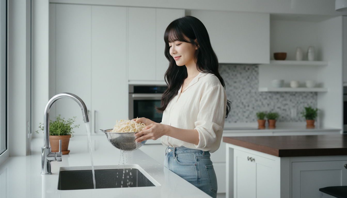 구입한 콩나물은 사용하기 전 흐르는 물에 두세 번 씻어줍니다. 뿌리 쪽을 제거하는 분들도 있는데, 사실 뿌리를 정리하지 않아도 맛에 큰 차이는 없습니다. 시간이 넉넉하다면 다듬어도 좋고, 바쁠 때는 깔끔하게 씻는 것만으로도 충분합니다. 📌