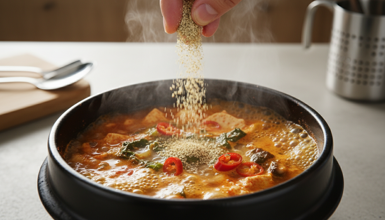 여기서 들깻가루는 국물에 고소함과 진한 풍미를 더해주는 재료인데, 빠뜨리면 맛이 한층 허전해지니 꼭 넣는 것을 권장합니다. 완성된 양념장은 국물이 충분히 우러난 뒤 넣어주세요.