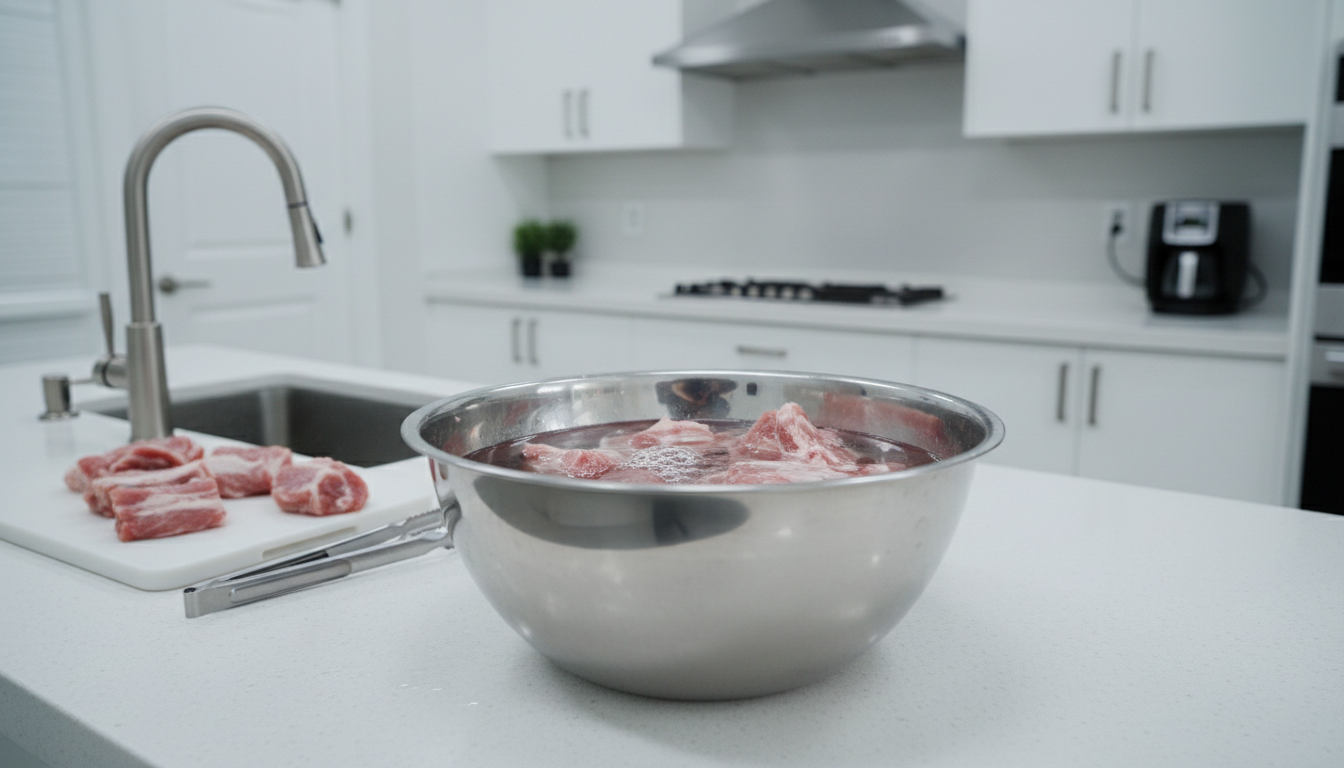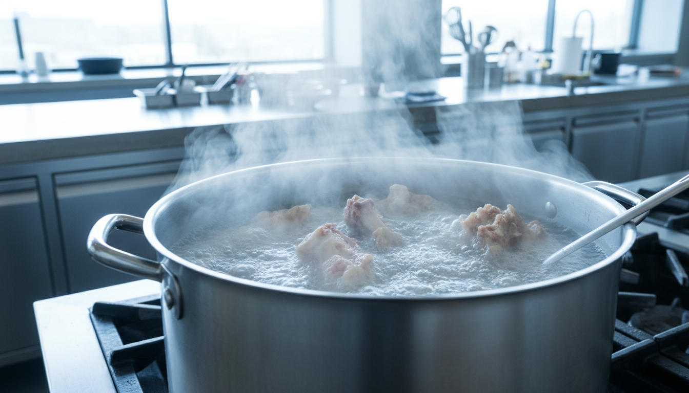 핏물을 뺀 뼈는 끓는 물에 넣고 5분 정도 데쳐서 불순물을 제거한 뒤, 찬물에 깨끗이 씻어줍니다. 이 과정만 제대로 해도 잡내의 절반은 잡힌다고 보시면 됩니다. 📌