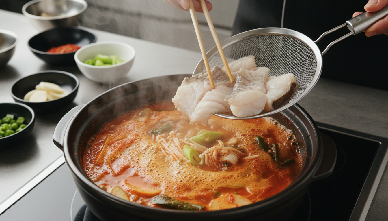 육수가 바글바글 끓을 때 손질한 도다리를 넣어줍니다. 다진 마늘과 맛술(또는 생강술)을 함께 넣으면 잡내가 잡혀요. 끓는 동안 떠오르는 거품은 국자나 스푼으로 꼼꼼하게 걷어내야 국물이 맑고 깨끗하게 완성됩니다. ✅