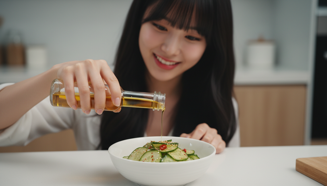 참기름을 처음부터 넣으면 양념이 오이 표면에 고루 배어들지 못하고 겉돌게 됩니다. 재료를 모두 넣은 뒤 손으로 살살 버무려 양념이 오이에 고르게 입혀지도록 합니다. 마지막으로 참기름과 통깨를 더해 한 번 더 가볍게 섞으면 오이무침 황금레시피 완성입니다.