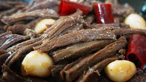 잘 삶아진 고기는 건져내어 한 김 식힙니다. 너무 뜨거울 때 무리해서 만지지 마시고, 손으로 만질 수 있을 정도가 되면 고깃결을 따라 먹기 좋은 두께로 찢어줍니다.
